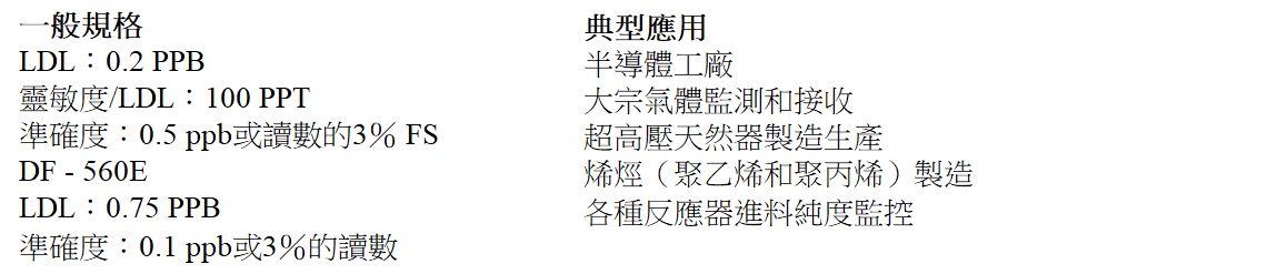 本系列可單獨測量或是與 Delta F NanoTrace氧氣分析儀組合在同一個19”的機櫃上進行測量,Delta F 700系列能在不同的惰性氣體背景中進行水分測量,同樣也能在活性氣體下進行測量,如氨、氯化氫以及磷化氫中適合於很多專業化的應用,包括半導體製造中高純度氣體分配系統的水分分析,還有量測氨氣中的水分。
