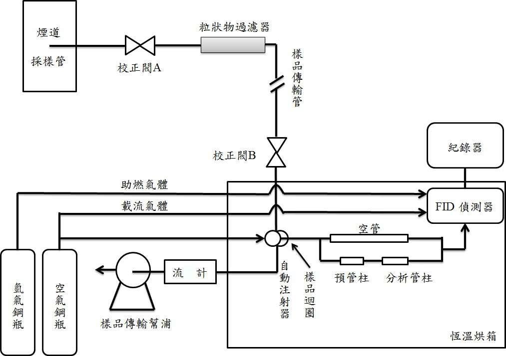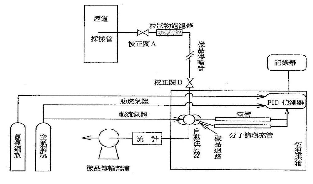 本方法從排放管道中透過採樣裝置將氣體樣品連續抽出,樣品直接通過空管後進入火焰離子化偵測器( Flame ionization detector , FID )測得排放管道中之總碳氫化合物( Total hydrocarbon , THC ) 含量;另將樣品導入另一途徑測得甲烷(Methane)含量,本方法測得甲烷含量之方式有二: