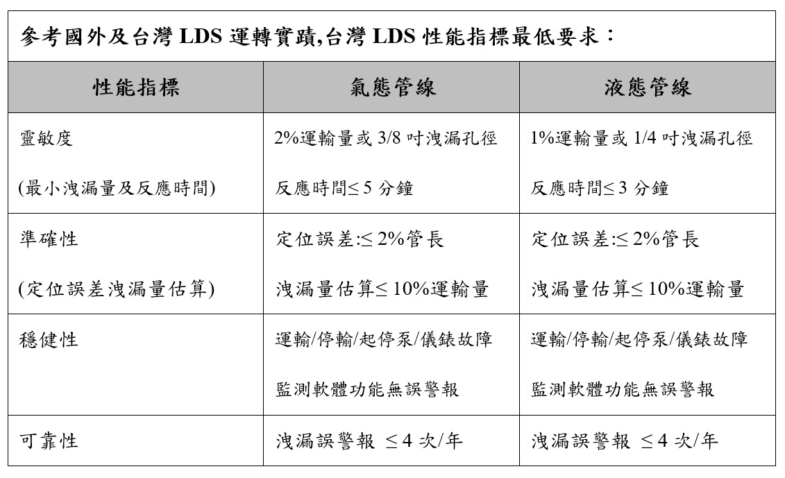 依我公司與既有工業管線業者,就管線安全實施完整性管理上,擬定LDS最低要求的指標,訂為驗收之最低標準如下表。