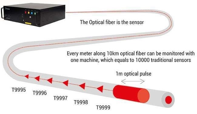溫度感測光纖工作原理DTS 系統包含脈衝雷射發射器,它以大約 1m 脈衝(相當於 10ns 時間)向光纖發送。當脈衝沿著光纖的內徑移動時,它與玻璃相互作用。由於玻璃中的微小缺陷,少量原始鐳射脈衝被反射回到 DTS 感測系統中。通過分析反射光,DTS 能夠計算事件的溫度(通過分析反射光的功率) ,以及事件的位置(通過測量回來的 散光返回的時間)通常到一米之內誤差。