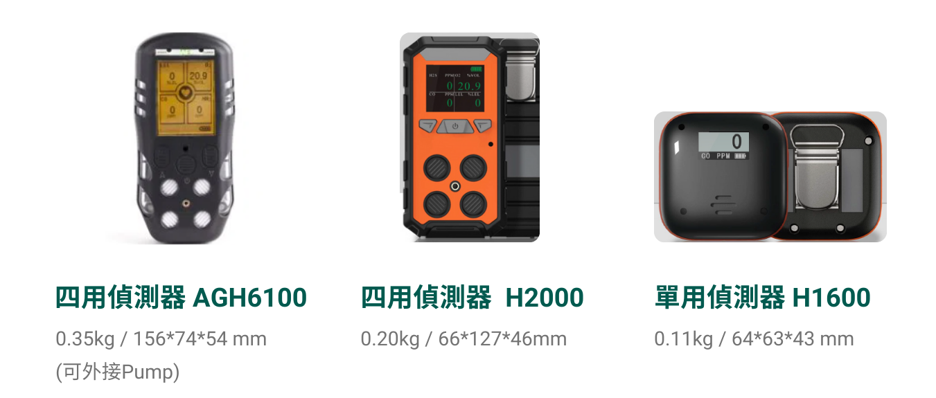 兩者在尺寸、重量、電力需求上會有差別。環境檢測用攜帶式氣體檢測器通常是在人員進入該環境前使用,如人孔、地水道、容器。
