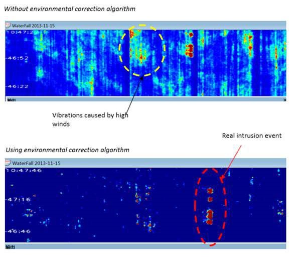 其次,利用FenceSentry SSOS軟體演算法中包含的Bandweaver環境校正演算法也很重要。下面您可以看到環境校正演算法在這種困難環境中的有效性示例。