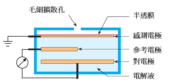 當待測氣體擴散進入半透膜,溶解於電解液中接觸到感測電極,在電極表面產生氧化或還原反應(取決於氣體),形成離子與電子等帶電物質。帶電物質在電解液中由感測電極擴散至對電極形成電路,經由量測電流變化即可得知氣體濃度。