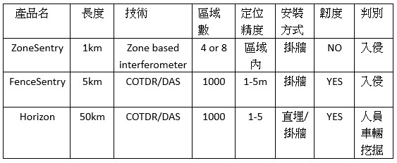 Bandweaver 根據特定場址具體情況,提供一系列基於光纖的 PIDS 解決方案。有不同產品的規格概述如下。