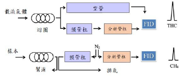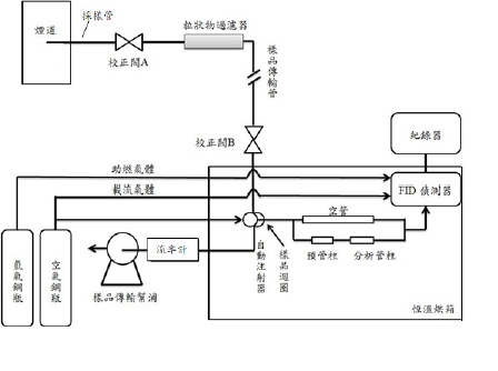 本方法從排放管道中透過採樣裝置將氣體樣品連續抽出,樣品直接通過空管後進入火焰離子化偵測器(Flame ionization detector,FID)測得排放管道中之總碳氫化合物(Total hydrocarbon,THC)含量;另將樣品導入另一途徑測得甲烷(Methane)含量,本方法測得甲烷含量之方式為層析管逆吹法:樣品藉由層析管分離甲烷後,搭配逆吹程序將非甲烷碳氫化合物逆吹,而甲烷進入FID 測得;總碳氫化合物扣除甲烷後即得非甲烷總碳氫化合物含量,所測得濃度以相當於甲烷表示。