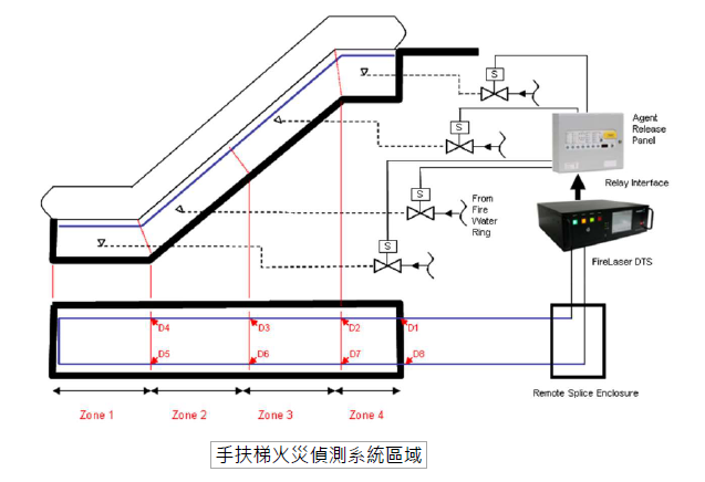 在此範例中,DTS控制單元被設定為多個偵測區域,沿著電扶梯的長度分布,並包含「端點區域」。電扶梯兩端的這些區域通常風險較高,因為這些地方常設有電氣設備,且往往是最容易堆積廢棄物的區域。一般而言,每個偵測區域都會有一個對應的輸出繼電器,該繼電器再連接至主火災警報控制面板(FACP)。在部署相關噴水頭系統的安裝中,繼電器觸點可能會連接至滅火劑釋放面板。圖示說明了如何配置滅火劑釋放面板,以啟動基於區域的噴淋釋放系統,分為四個獨立的火災偵測/噴淋釋放區域。