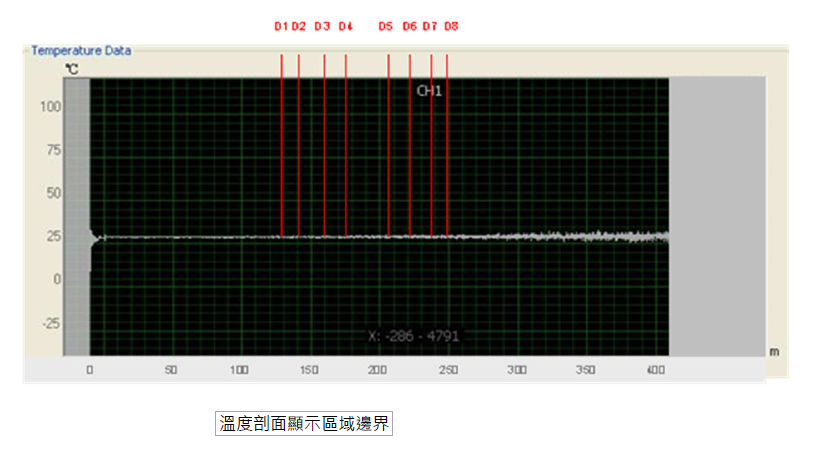 D1 到 D8 對應於FireLaser光纖偵溫系統測量值,如下圖所示的溫度剖面所示。FireLaser會快速且持續地計算溫度剖面,控制單元則判斷是否發出警報決策。系統持續監控背景故障類型事件。警報信號透過繼電器接點傳送至火災警報控制面板或滅火劑釋放面板。