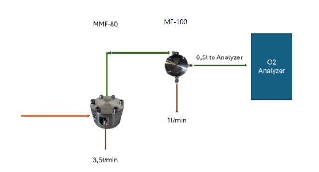 MF-100 確保進入氧氣分析儀的氣流保持潔淨、乾燥且僅含氣體,從⽽保障電化學cell的 期穩定性與最⼩漂移。