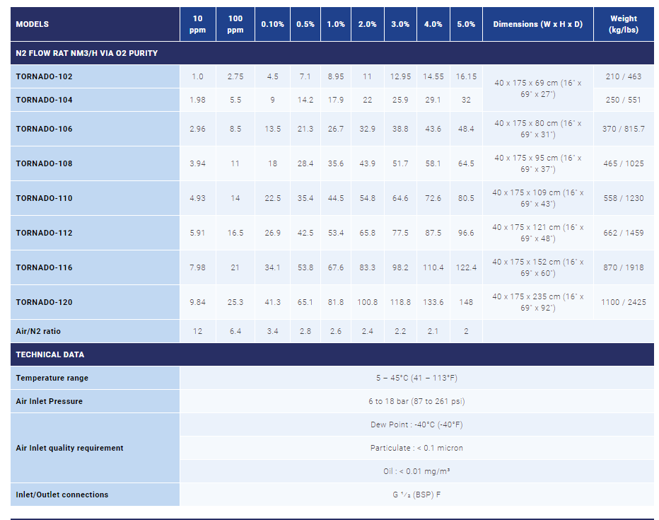 LCMS、樣品蒸發、核磁共振、ICP、食品包裝、激光切割、石油和天然氣、電子組裝/焊接、釀酒和釀造 TORNADO 系列氮氣發生器為您提供獨特的、創新的氮氣供應解決方案。 可以從您現有的壓縮空氣供應中生產可靠、安全的氮氣源,無需液氮或高壓氣瓶。 TORNADO 氮氣發生器專為連續運行而設計,可產生從每分鐘幾升到超過 NM3/H 的流量,氧氣含量殘留純度為 10 ppm 至 5%。 發生器使用最新的 HMI 觸摸屏技術進行控制,以顯示過程、壓力、入口空氣露點和氧氣水平,並帶有警報的連續監控。
